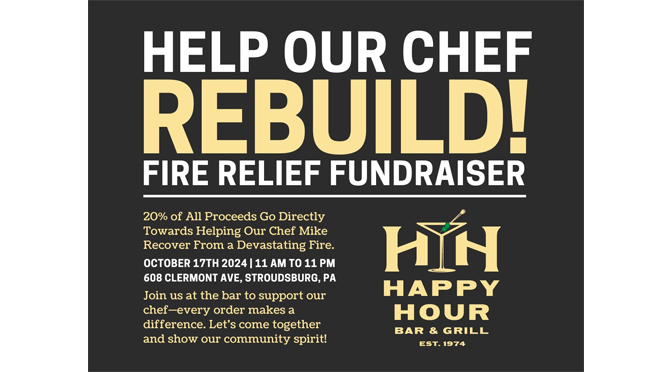 Stroudsburg, PA – On Thursday, October 17th, 2024, Happy Hour Bar & Grill will host a Fire Relief Fundraiser to support their chef, Mike, and his family, who recently lost everything in a catastrophic fire. The event will take place from 11 AM to 11 PM at 608 Clermont Ave, Stroudsburg, PA.