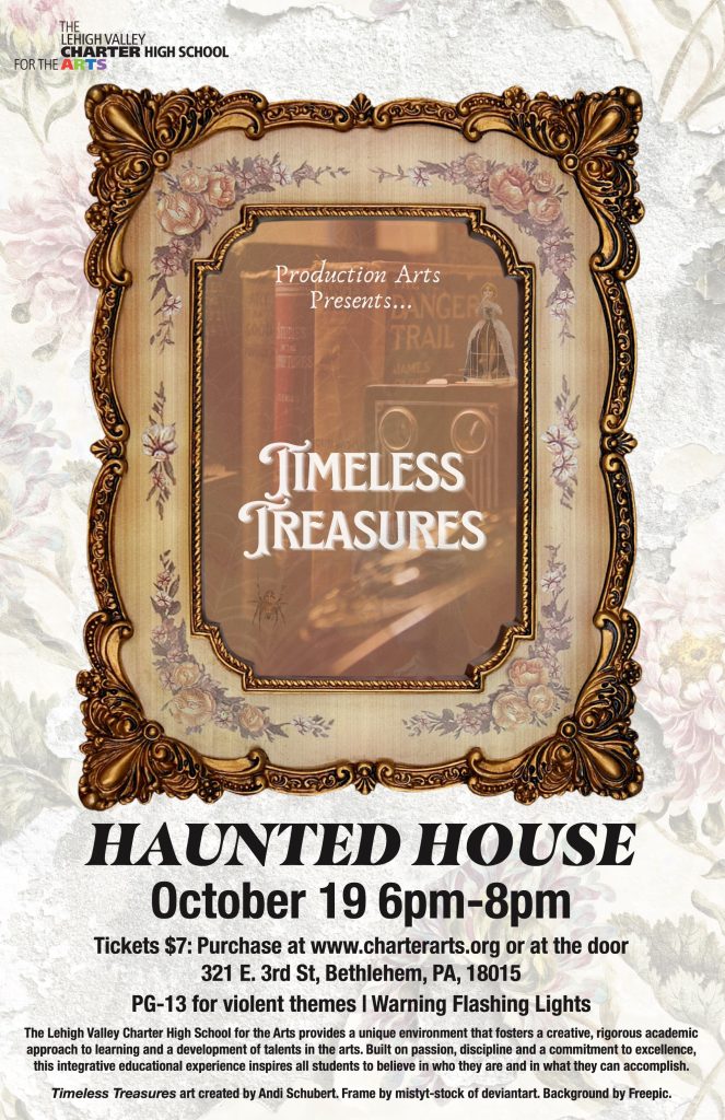 BETHLEHEM, PA: The Lehigh Valley Charter High School for the Arts (Charter Arts) Production Arts Department (Film & Technical Theatre) invites you to experience its “Timeless Treasures” Haunted House, October 19, 2024, from 6-8 PM, in the school’s theatre, located at 321 East Third Street, Bethlehem.