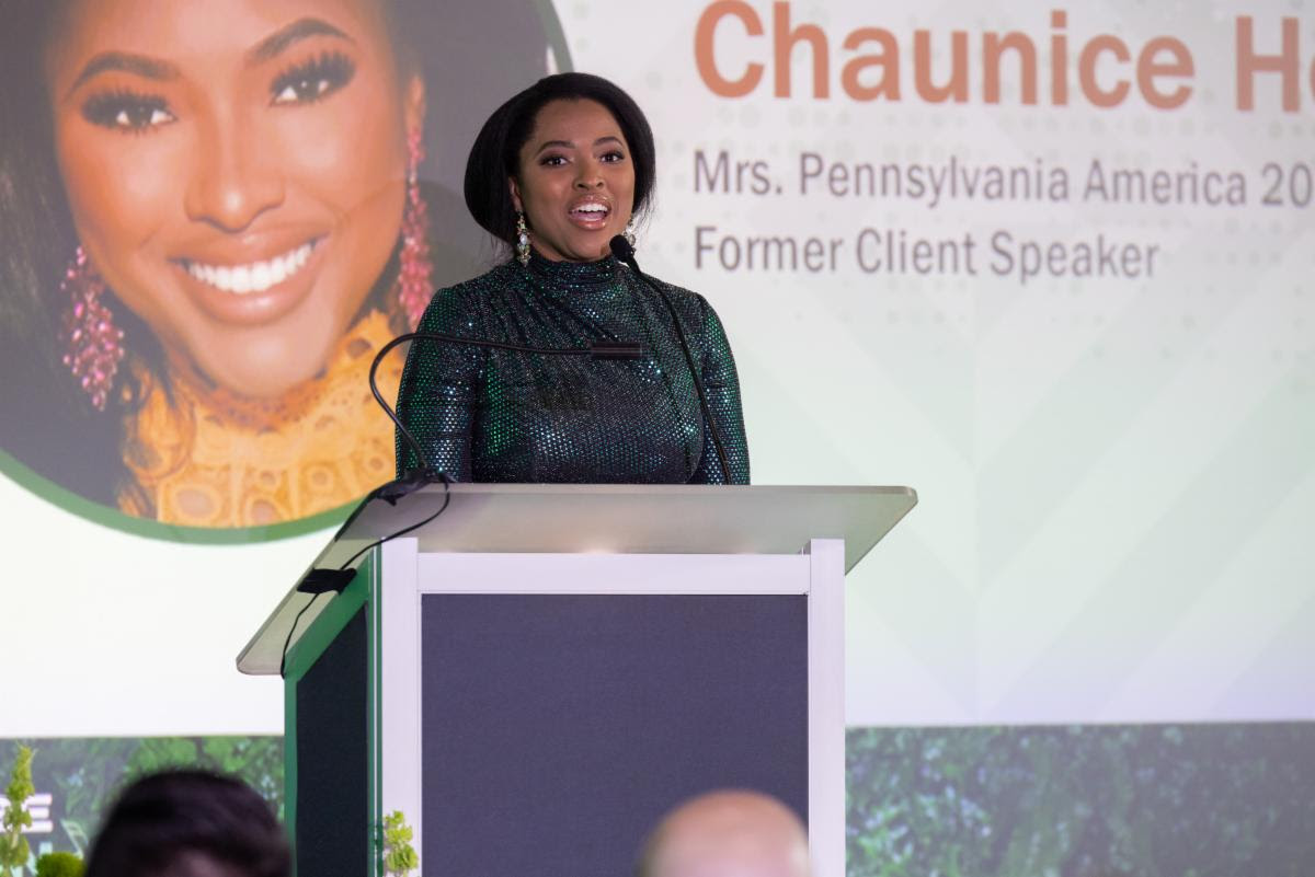 Chaunice Holley, BSN, RN, Retired United States Air Force and Mrs. Pennsylvania America 2023, delivered an inspiring speech about her journey from adversity to achievement. Holley spoke of the support she found at Valley Youth House, which helped her embrace new opportunities and pursue her dreams. Reflecting on her path, she emphasized the value of shifting one’s outlook, saying, “Perspective is everything—it’s the lens through which we see our circumstances, and changing that lens can change your whole life.” Her story resonated with attendees as a powerful testament to transformation, hope, and the lasting impact of Valley Youth House’s support.