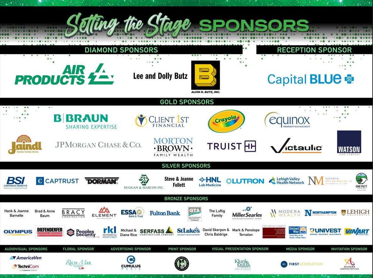 Lee & Dolly Butz and Alvin H. Butz, Inc. were recognized as the event’s Distinguished Honorees. Event Chairs Mike Butz of Alvin H. Butz, Inc., Laurie Hackett of Air Products, David M. Jaindl of Jaindl Companies, L. Charles Marcon of Duggan and Marcon, Inc., and Kim Rompilla of Crayola, were also recognized for their leadership.