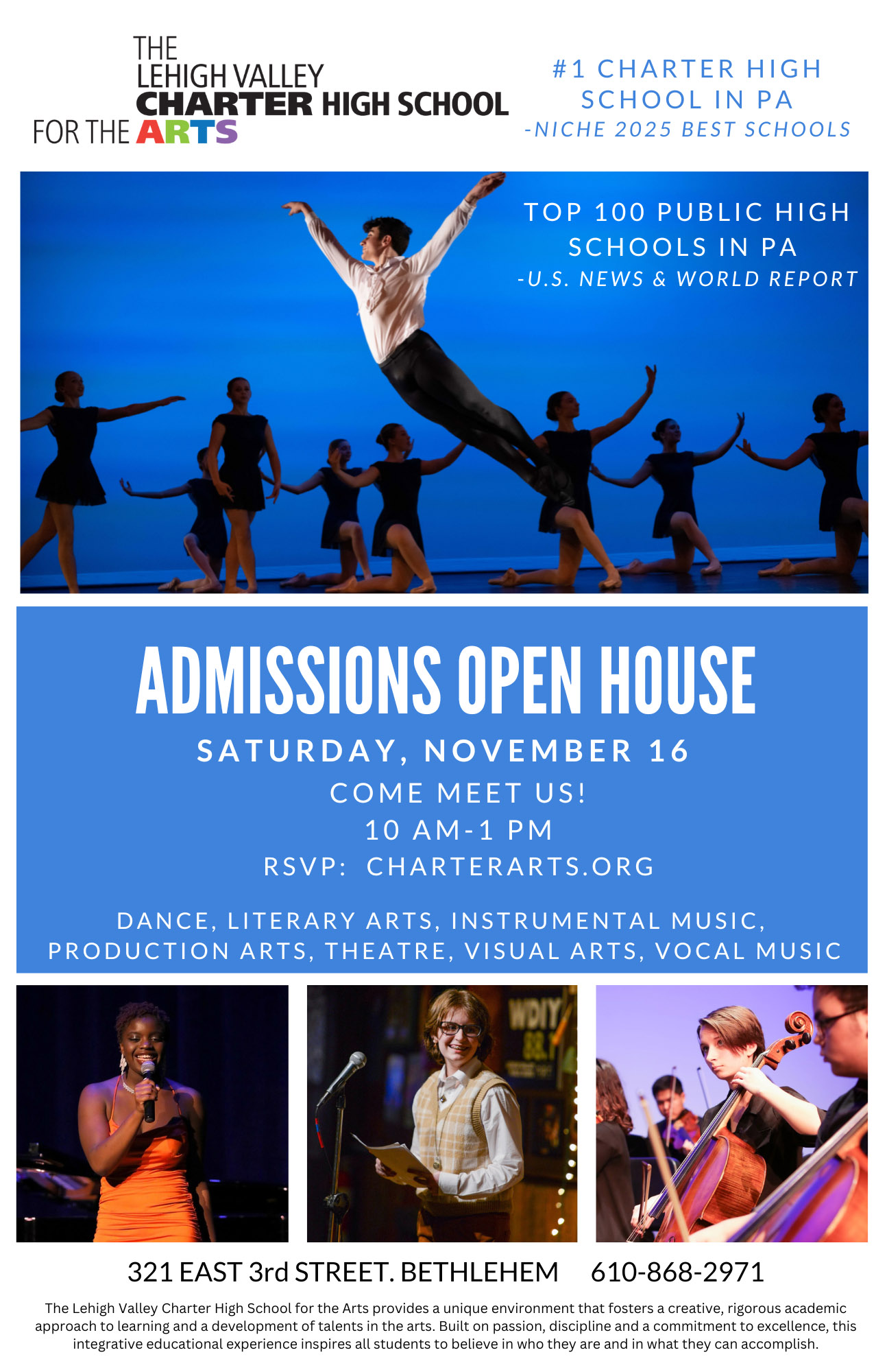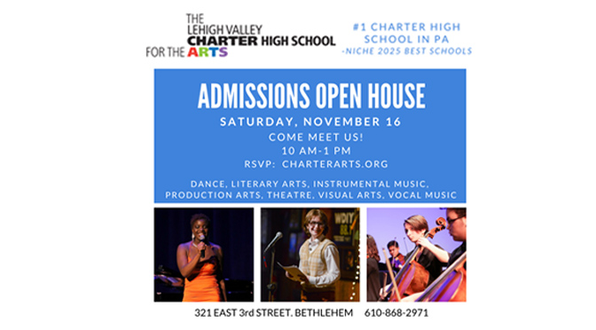 BETHLEHEM, PA– The Lehigh Valley Charter High School for the Arts (Charter Arts) will hold an Admissions Open House on Saturday, November 16th from 10 AM-1 PM. This event is a great first step for prospective students and families to learn more about the school’s rigorous curriculum, admissions process and more! Attendees will have the opportunity to tour the school facility and attend breakout sessions with directors of the school’s various artistic departments.