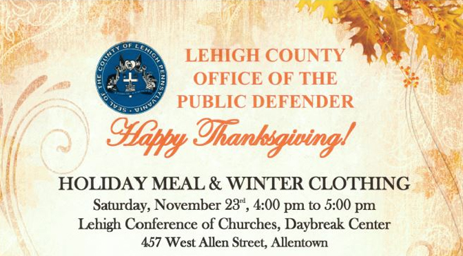 Allentown, PA- On Saturday, November 23rd the Lehigh County Office of the Public Defender will hold its Community Outreach Holiday Dinner event. The free event will provide a variety of outreach services for struggling residents which include, but are not limited to; a free holiday dinner, free food to take home, free winter clothing, and information and resources on sealing criminal records, expungements, and pardons provided by the Pardon Project of Lehigh County.