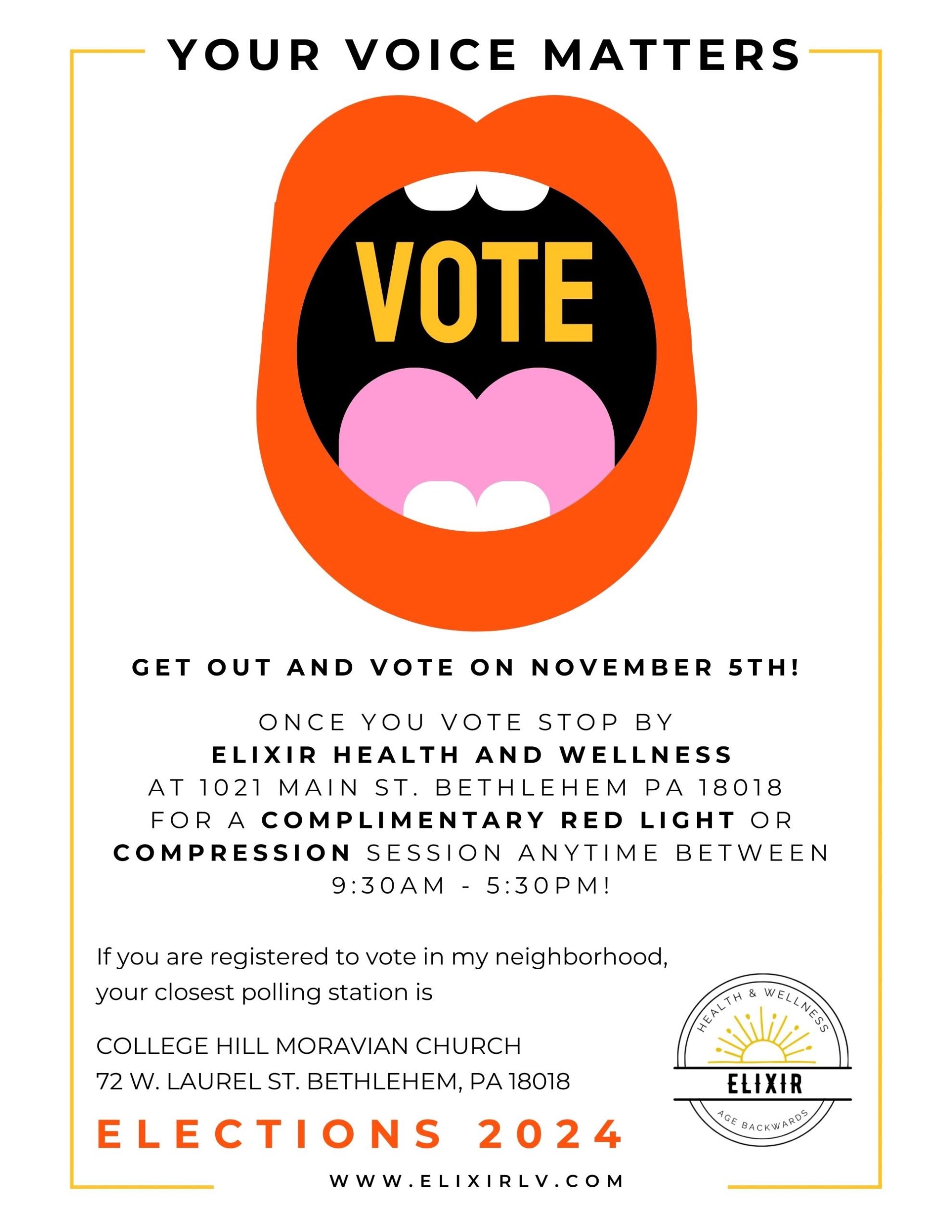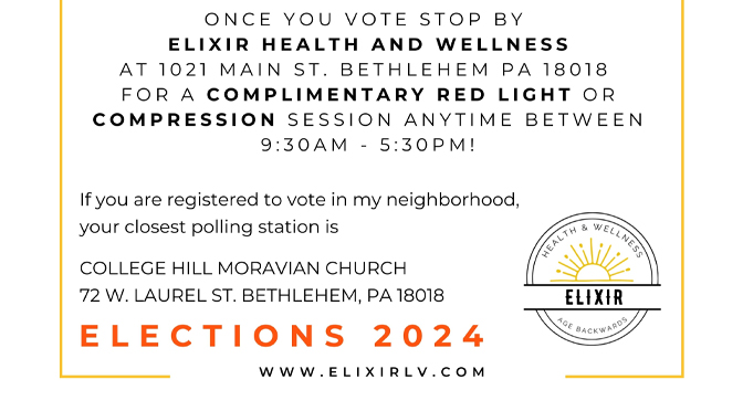 Bethlehem, PA – ELIXIR Health and Wellness, Bethlehem’s premier destination for non-invasive, anti-aging therapies, is excited to announce a special Election Day initiative to promote community engagement and support voter turnout. On Tuesday, November 5th, all voters across the Lehigh Valley are invited to stop by Elixir Health and Wellness, located at 1021 Main Street, Bethlehem, PA, for a complimentary session of red light or compression therapy between 9:30 a.m. and 5:30 p.m.
