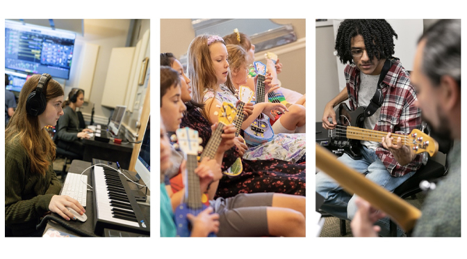 PHOTO (L-R): Community Music School students work on Music & Film projects in the CMS Recording Studio, participate in a group ukulele class, and engage in a private bass guitar lesson. Businesses can now support these innovative educational programs at CMS through Pennsylvania’s Educational Improvement Tax Credit (EITC) program.
