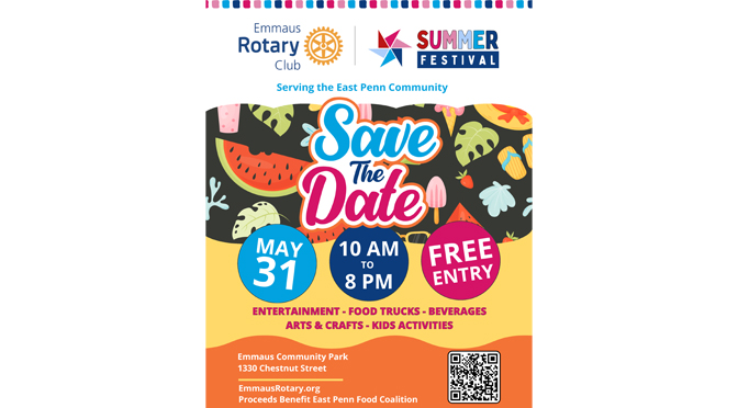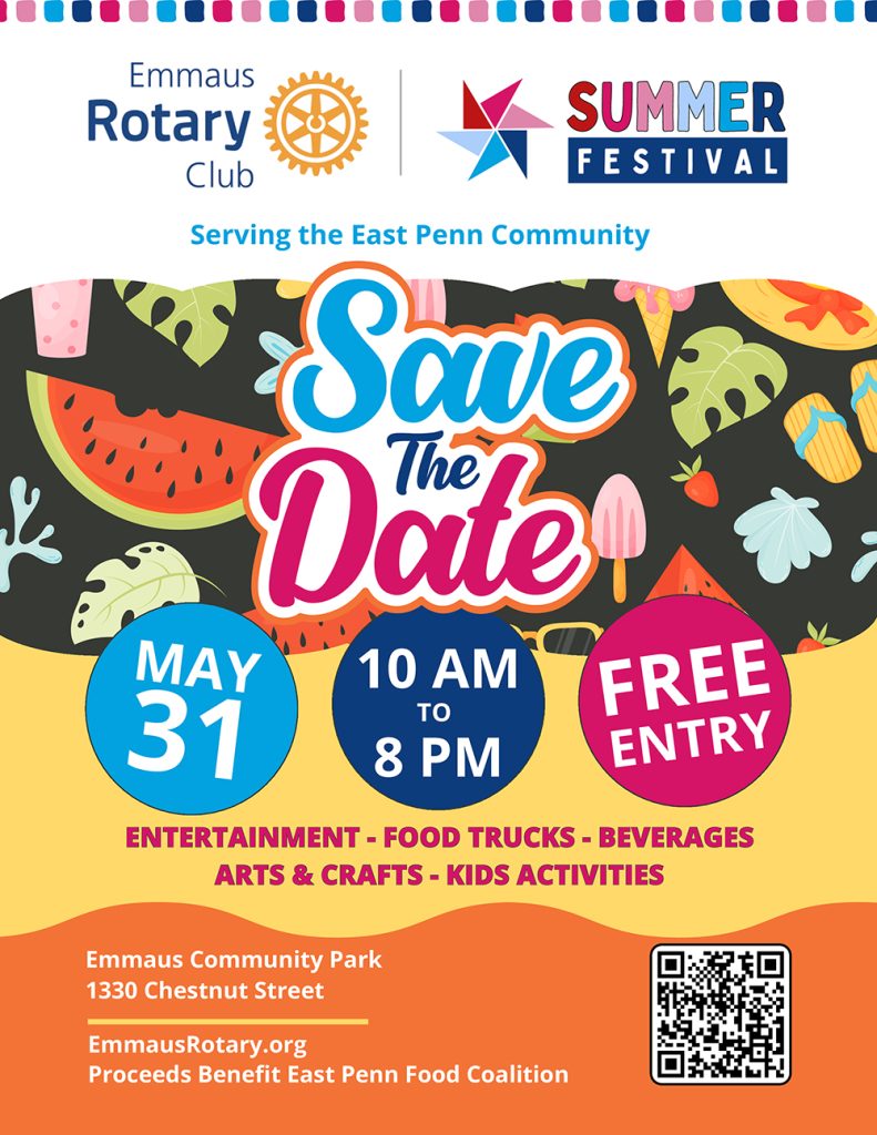 Emmaus, PA — Get ready for a brand-new tradition in the East Penn area! The Emmaus Rotary Club is proud to announce its First Annual Summer Festival, happening this May 31st, at Emmaus Community Park. This exciting inaugural event will bring together neighbors, families, and friends for a day packed with entertainment, fun, and community spirit—all while supporting a vital cause.