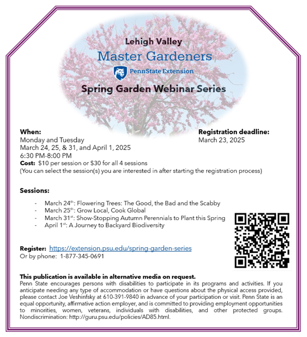 Prepare for a vibrant spring season with the 2025 Spring Garden Series, presented by the Master Gardeners of Lehigh and Northampton Counties. This year’s lineup features expert-led talks designed to inspire and guide your gardening journey, from essential tree recommendations to recipes that celebrate locally grown, culturally diverse produce. Join us for highlights from Leah Brooks of the Mt. Cuba Center, who will present “Show-Stopping Autumn Perennials for Spring Planting,” and Katie Fisk, who will show us how she turned her backyard into a wildlife oasis. Don’t miss this opportunity to cultivate new knowledge and fresh ideas for your garden!