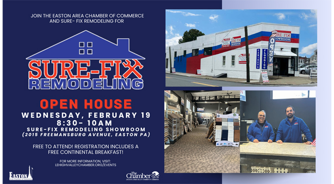 The Easton Area Chamber of Commerce invites you to kickstart your morning with great company, valuable connections, and a delicious continental breakfast at Sure-Fix Remodeling’s Open House on February 19, 2025, from 8:30 AM to 10:00 AM.