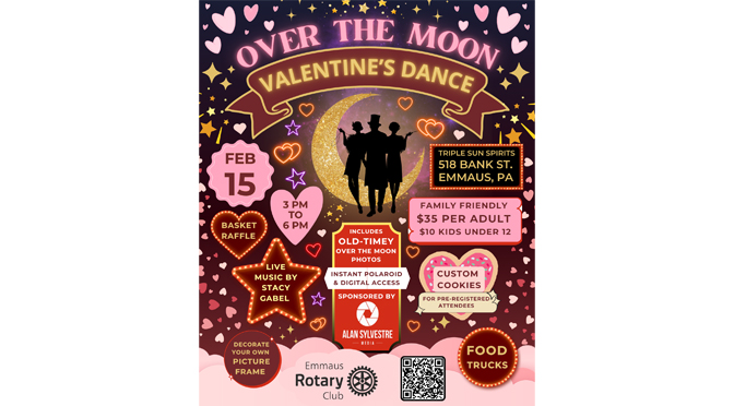 Emmaus, PA – Dust off your dancing shoes, bring your loved ones, and get ready for an afternoon of fun and community spirit at the Emmaus Rotary Club’s “Over the Moon Valentine’s Dance”! This unforgettable event, designed for kids-at-heart of all ages, is happening on Saturday, February 15, 2025, from 3 PM to 6 PM at Triple Sun Spirits, 518 Bank St., Emmaus, PA.