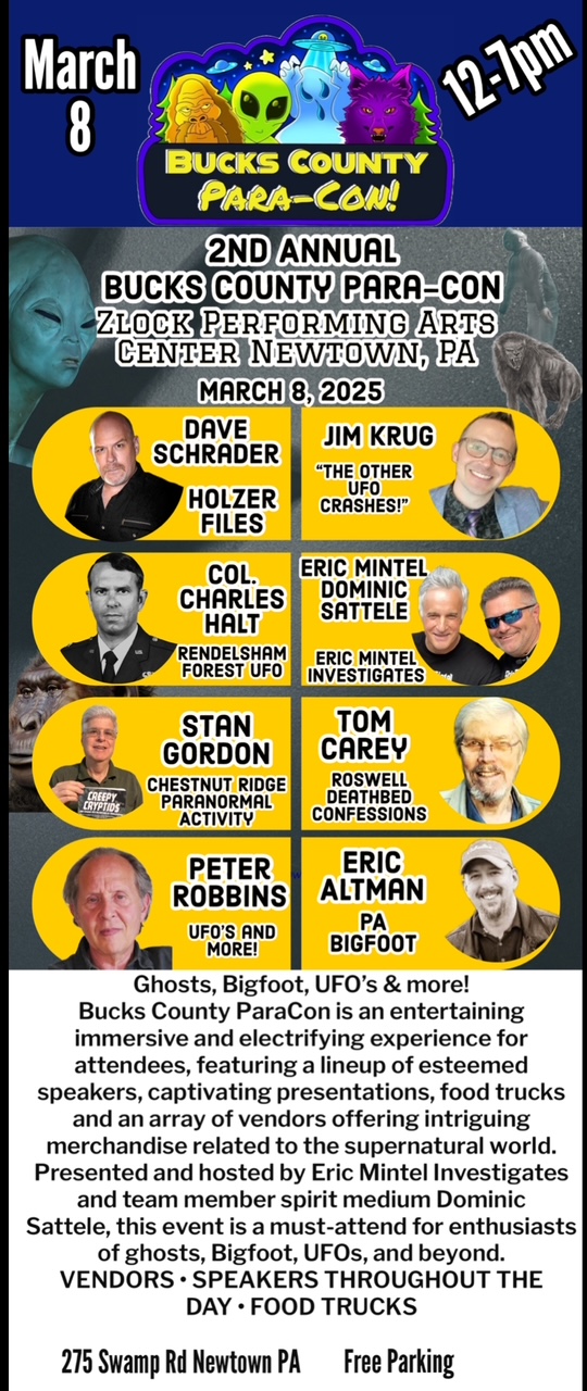 Newtown, PA – On March 8th, paranormal enthusiasts are in for a spine-tingling treat at the 2nd Annual Bucks County Paracon, hosted by Eric Mintel Investigates! This all-day event will take place at Bucks County Community College, 275 Swamp Rd, Newtown, PA, and promises to be an unforgettable experience for anyone fascinated by the unknown.