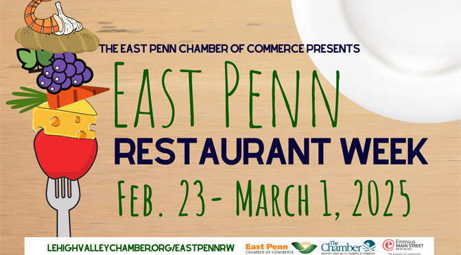 East Penn, PA – The East Penn Chamber of Commerce, proud partner of the Greater Lehigh Valley Chamber of Commerce, is excited to announce the return of East Penn Area Restaurant Week, taking place from Sunday, February 23rd to Saturday, March 1st, 2025! This annual event invites the Lehigh Valley to explore and support the incredible local dining scene throughout Alburtis, Emmaus, Lower Macungie, Macungie, and Upper Milford.