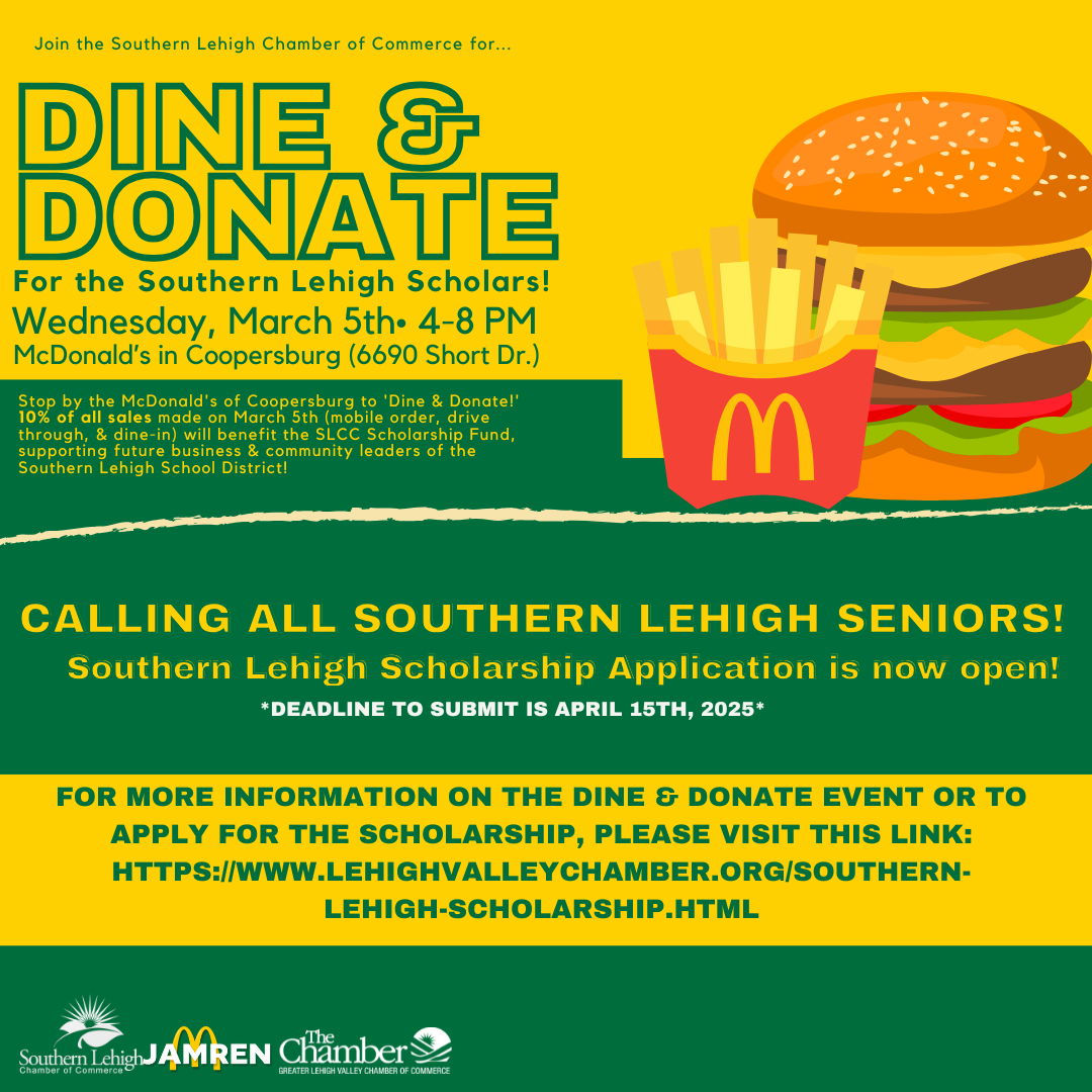 Coopersburg, PA – The Southern Lehigh Chamber of Commerce, proud partner of the Greater Lehigh Valley Chamber of Commerce, invites the community to come together for a special Dine & Donate event in efforts to support of the Southern Lehigh High School Scholarship Fund. Come out hungry and ready to support our future business and community leaders from the Southern Lehigh area on Wednesday, March 5th from 4:00 PM to 8:00 PM at McDonald’s in Coopersburg.