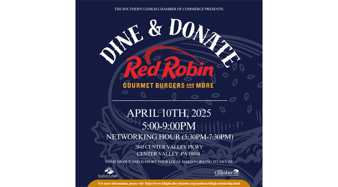 Center Valley, PA. – The Southern Lehigh Chamber of Commerce, proud partner of the Greater Lehigh Valley Chamber of Commerce, is teaming up with Red Robin of Center Valley to host a delicious and impactful community fundraiser in support of the Southern Lehigh Scholarship Fund. On Thursday, April 10th, from 5:00 PM to 9:00 PM, Red Robin at The Promenade in Center Valley will generously donate 20% of all dine-in and takeout sales to help a local Southern Lehigh High School Student to pursue their higher education dreams.