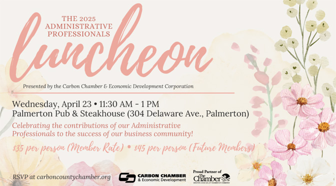 PALMERTON, PA – The Carbon Chamber & Economic Development Corporation (CCEDC), proud partner of the Greater Lehigh Valley Chamber of Commerce, is proud to host the 2025 Administrative Professionals Luncheon on Wednesday, April 23, from 11:30 AM to 1:00 PM at the Palmerton Pub and Steakhouse. This special event will honor the dedication and invaluable contributions of administrative professionals throughout Carbon County.