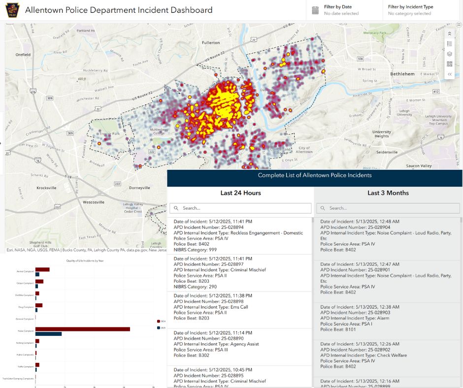 May 13, 2025 — The City of Allentown and the Allentown Police Department have launched a new interactive Incident Dashboard aimed at increasing transparency, building community trust, and improving public safety through real-time data sharing.