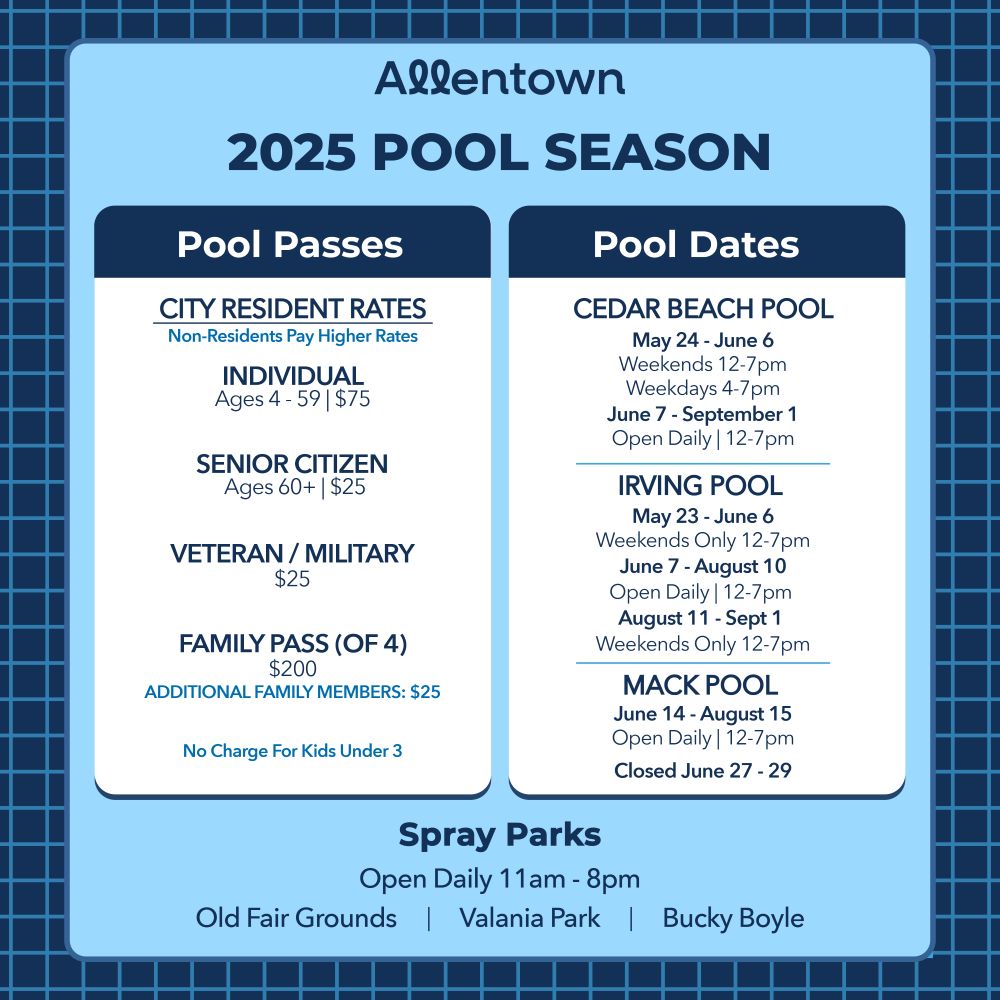 For more information about season passes, pool rules, and weather-related updates, please visit www.allentownpa.gov/pools or contact the Department of Parks and Recreation at (610) 437-7750.