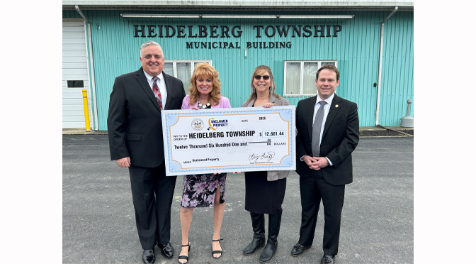 “Heidelberg Township was thrilled to hear the Pennsylvania Treasury Department had found several unclaimed properties belonging to the township, totaling $12,601.44!” Didra said. “These are dollars that belong to the township, but for whatever reason, the township never received them. These funds will be deposited into the general fund and will help cover the costs of projects undertaken by the township this year to enhance the lives of our residents. The township encourages residents to check if they have any unclaimed property by visiting the Pennsylvania Treasury website.”