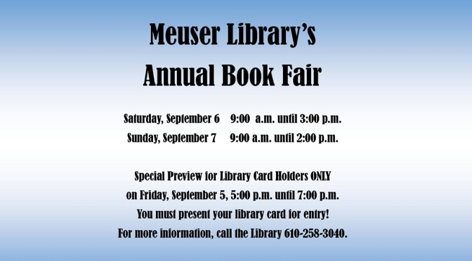 The Mary Meuser Memorial Library will host their 49th Annual Community Book Fair on Saturday, Sept. 6, 9 am – 3 pm, & Sunday, Sept. 7, 9 am – 2 pm, rain or shine under the tents on the Library grounds at 1803 Northampton Street in Wilson Borough. Thousands of used books will be offered ranging in price from $.50 to $ 2.00. There will be an abundance of novels including many popular authors, as well as children’s books, anime, and a large selection of DVDs. Books from virtually every genre and subject will be available. Meuser Library card holders may shop early on Friday, September 5, 5:00 pm- 7:00 pm.