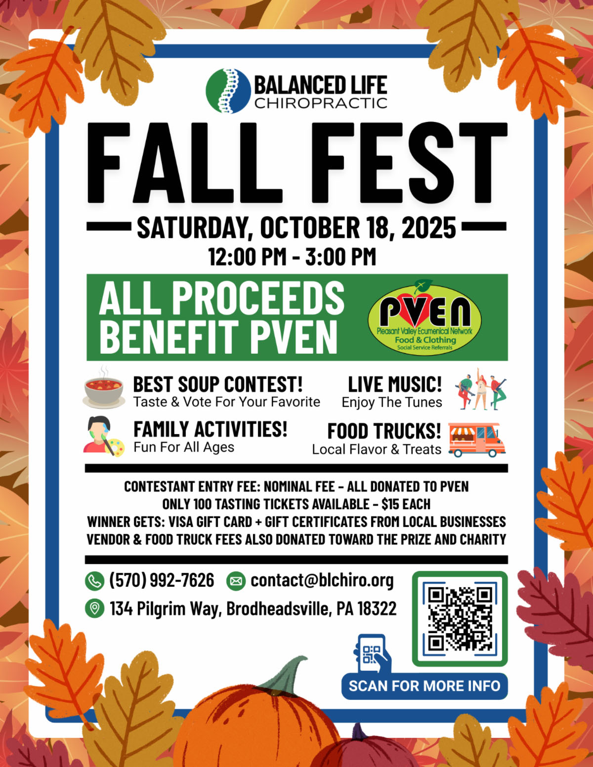 Brodheadsville, PA — Balanced Life Chiropractic is pleased to announce Fall Fest 2025, happening Saturday, October 18, 2025, from 12 PM to 3 PM at their Brodheadsville location. This family-friendly event will bring together the community for an afternoon of food, live music, activities, and seasonal fun. All in support of the Pleasant Valley Ecumenical Network (PVEN).