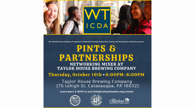 WHITEHALL, PA – The Whitehall Township Industrial & Commercial Development Authority (WTICDA), in partnership with the Whitehall Area Chamber of Commerce, proud partners of the Greater Lehigh Valley Chamber of Commerce, is hosting a special networking event next Thursday, October 16th from 6:00 to 8:00 p.m. at Taylor House Brewing Company in Catasauqua, PA. The evening will bring together business leaders, entrepreneurs, and community members from across the Lehigh Valley to connect in an informal, welcoming atmosphere. Registration is available now through the Lehigh Valley Chamber of Commerce website.