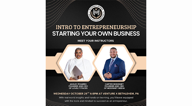 Bethlehem, PA – October 2025 – McKinney Media’s educational division, the McKinney School of Media & Marketing, is hosting its first Intro to Entrepreneurship: Starting Your Own Business workshop on Wednesday, October 29, 2025, from 6:00 – 10:00 PM at Venture X Bethlehem, 306 South New Street.