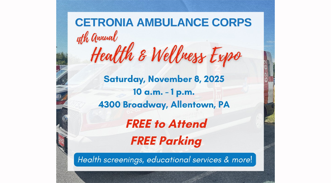 Allentown, PA – October 22, 2025 – Cetronia Ambulance Corps is excited to host its 4th Annual Health & Wellness Expo on Saturday, November 8, 2025, from 10 a.m. to 1 p.m. at the Joint Operations Facility, 4300 Broadway, Allentown, PA. The event is free and open to the public, with ample parking available.