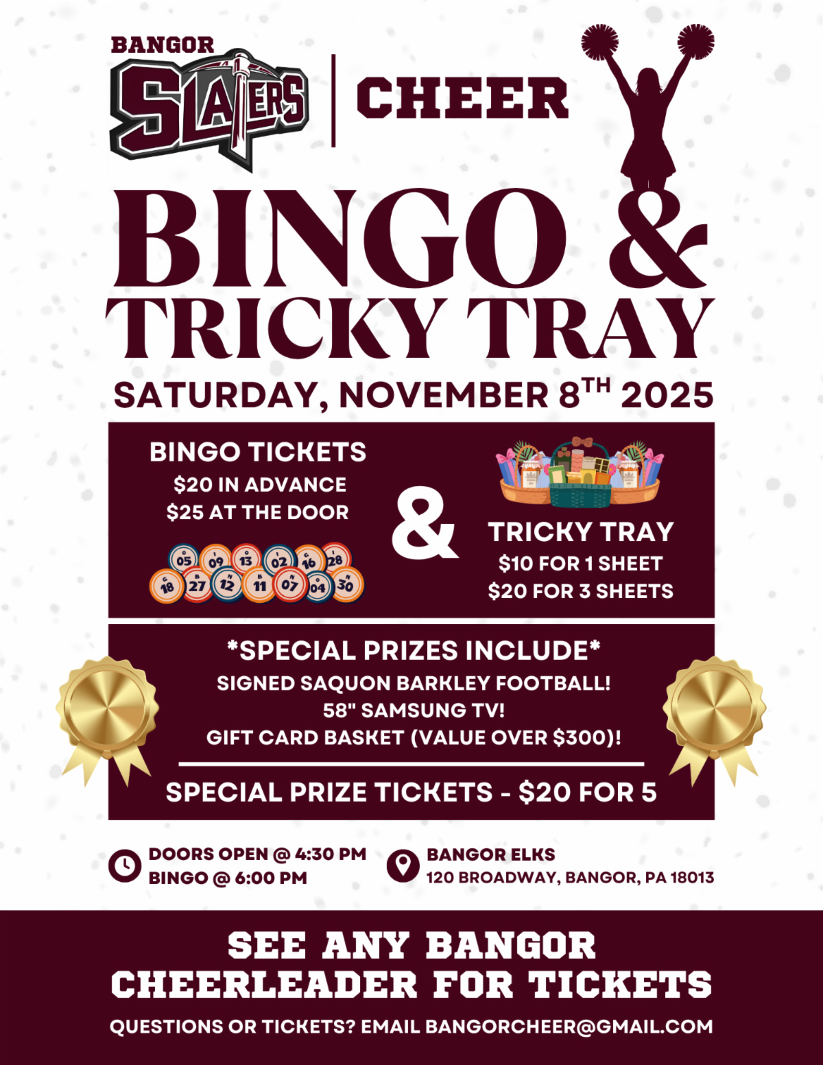 Bangor, PA: The Bangor Slaters Cheer program is excited to announce their Bingo & Tricky Tray fundraiser, taking place on Saturday, November 8th, 2025 at the Bangor Elks, located at 120 Broadway, Bangor, PA 18013.