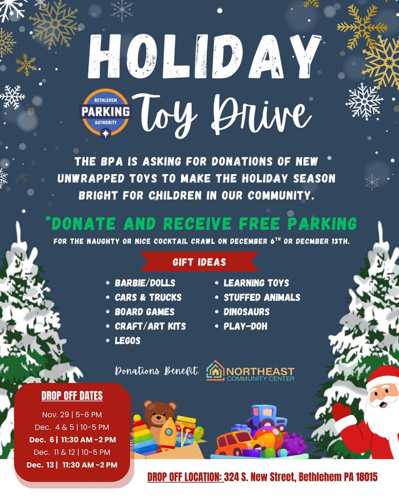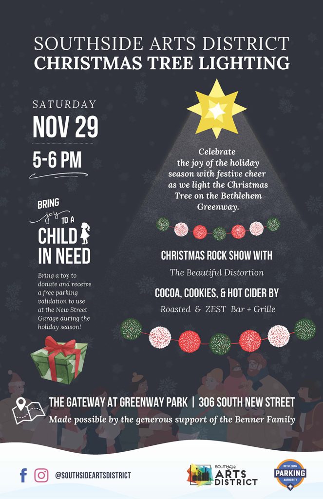 Families and friends are invited to gather at the Gateway at Greenway Park to enjoy live music, hot chocolate, cider, and homemade cookies from local restaurants Roasted and ZEST Bar + Grille. Donations for the Bethlehem Parking Authority’s Toy Drive will be collected at the event. Attendees are encouraged to bring new, unwrapped toys to bring joy to children in need during the holiday season.