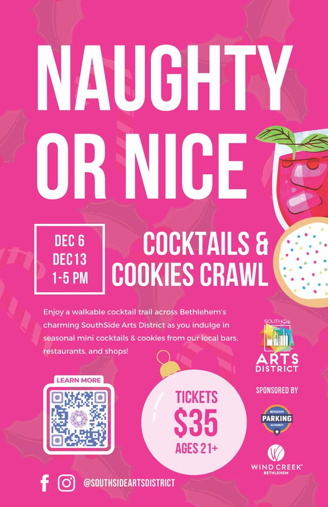 The holiday fun continues with the beloved Naughty or Nice Cocktails & Cookies Crawl. Participants will enjoy a walkable sampling adventure throughout the SouthSide, featuring holiday-themed mini cocktails and cookies crafted by participating SouthSide businesses. Tickets for each date are sold separately, and guests are encouraged to purchase early as space is limited. SouthSide Arts District will again be collecting donations for the Bethlehem Parking Authority’s Toy Drive. Guests who bring a new, unwrapped toy when picking up their tickets will receive a complimentary parking validation to the New St. Parking Garage to use during the holidays.