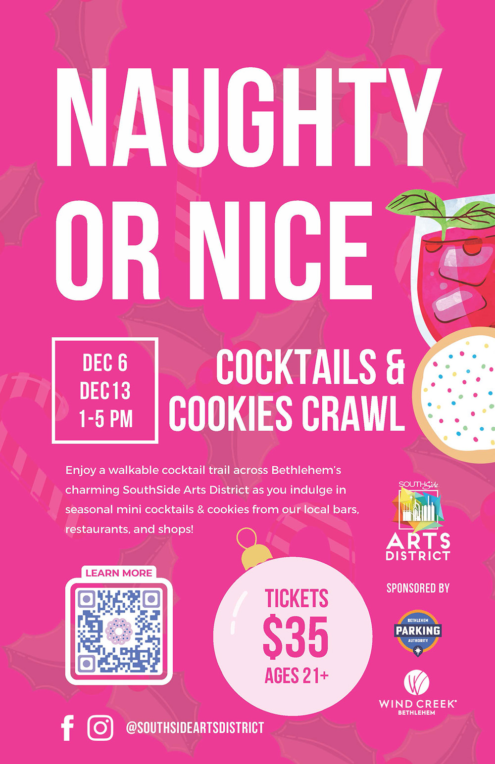 The Naughty or Nice Cocktails & Cookies Crawl is sponsored by Wind Creek and The Bethlehem Parking Authority.