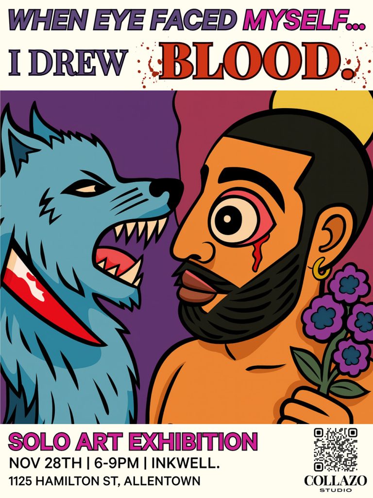 Allentown, PA- Collazo Studio is proud to announce When Eye Faced Myself, I Drew Blood, a groundbreaking solo exhibition by Lehigh Valley born artist Dylan Collazo, opening Friday, November 28, 2025, from 6–9 PM at Inkwell (1125 Hamilton St., Allentown, PA).