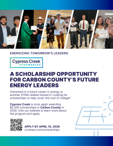 Carbon County, PA, February 2, 2026 – Cypress Creek Renewables (Cypress Creek) is pleased to announce the continuation of its Energizing Tomorrow’s Leaders scholarship program. After awarding $115,000 in scholarships across 25 counties in 2025, the program is being offered to high school seniors in 32 communities this year, including in Carbon County, PA.