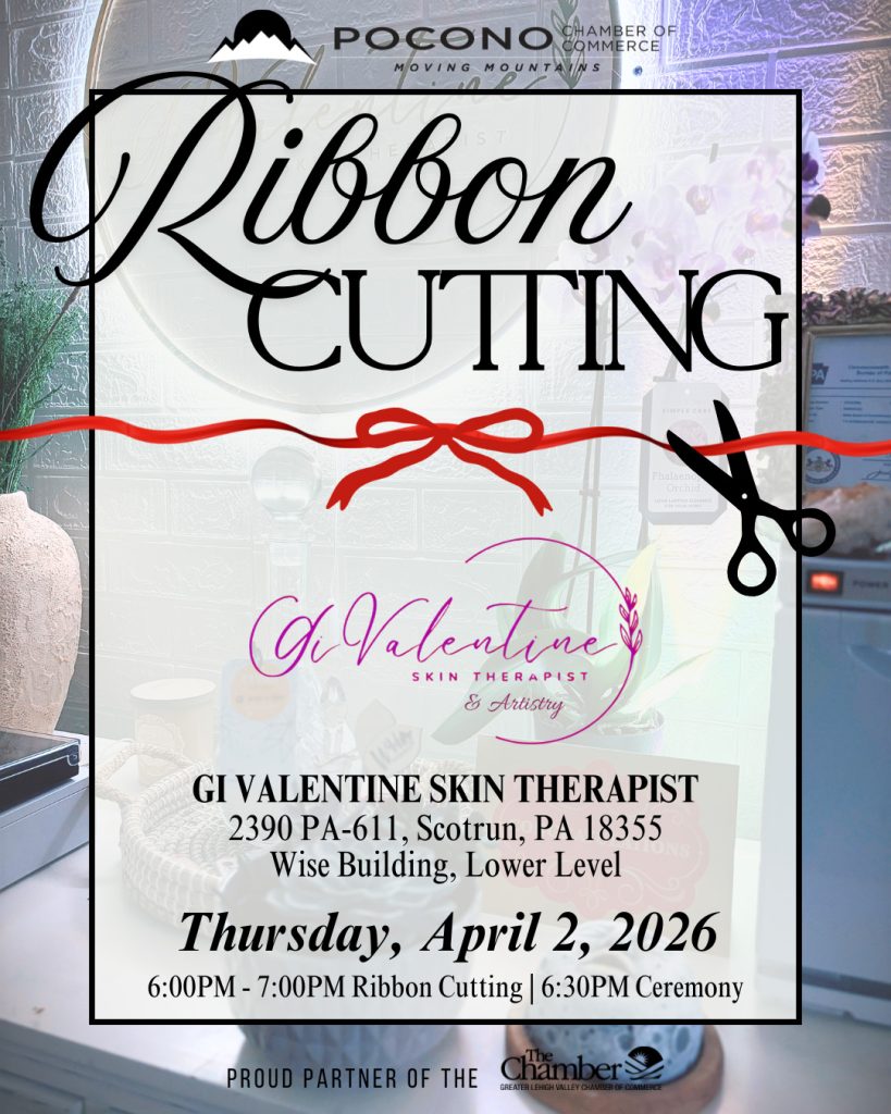 The Pocono Chamber of Commerce, a proud partner of the Greater Lehigh Valley Chamber of Commerce, invites the community to the Gi Valentine Skin Therapist Ribbon Cutting! This event will be held on Thursday, April 2nd, from 6:00 PM to 7:00 PM with the Ribbon Cutting Ceremony beginning promptly at 6:30 PM. This event is FREE and open to the public. Join us at 2398 PA-611, Scotrun, PA 18355 (Wise Building – Lower Level.)