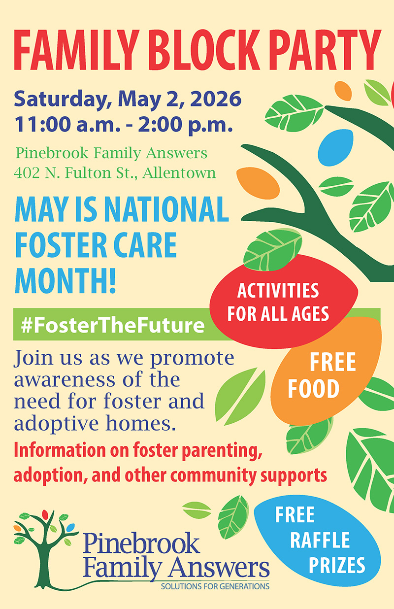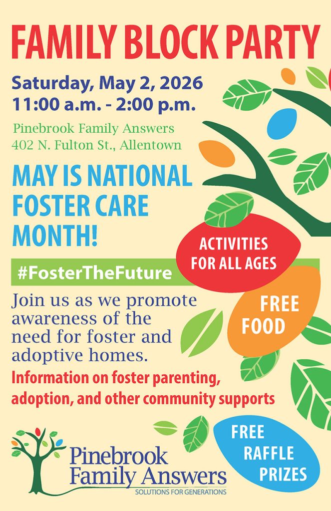 Lehigh Valley, PA – April 20, 2026 — Pinebrook Family Answers is celebrating National Foster Care Month with a free Community Block Party on Saturday, May 2, from 11 AM to 2 PM at our campus at 402 North Fulton Street, Allentown. Families, neighbors, and community members are invited to enjoy an afternoon of food, music, activities, face painting, balloon animals, and opportunities to learn more about foster parenting, adoption, and local resources.