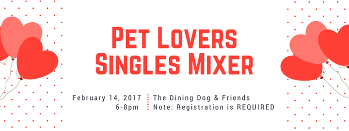Meet other pet lovers this Valentines Day. The Dining Dog & Friends Pet Lovers Singles Mixer. 6-8pm @ The Dining Dog & Friends Bring your pet for a few hours of meeting other singles that share the same love of animals. Pets are encouraged to join pet parents.