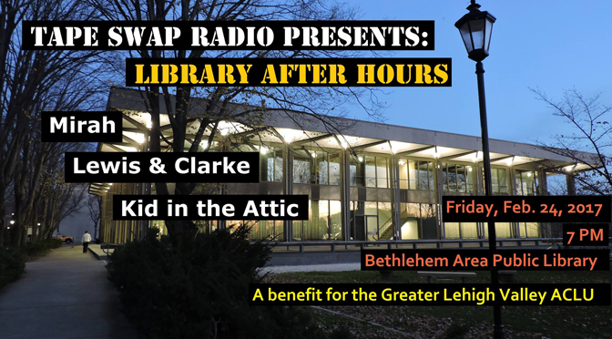 Music: Mirah, Lewis & Clarke, Kid in the Attic Where: Bethlehem Area Public Library – 11 W Church St, Bethlehem, PA 18018 When: Friday, February 24, 2017 | 7 – 10 PM Admission: $10 tickets, $8 with current student ID. All tickets available at door. All ages. Proceeds Donated To: The Greater Lehigh Valley Chapter of the ACLU of Pennsylvania More info: https://www.facebook.com/events/1750419308620838/