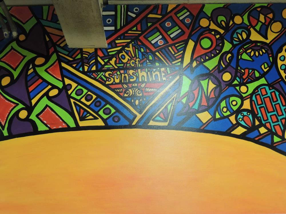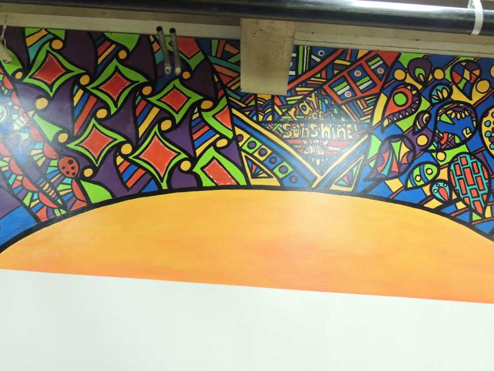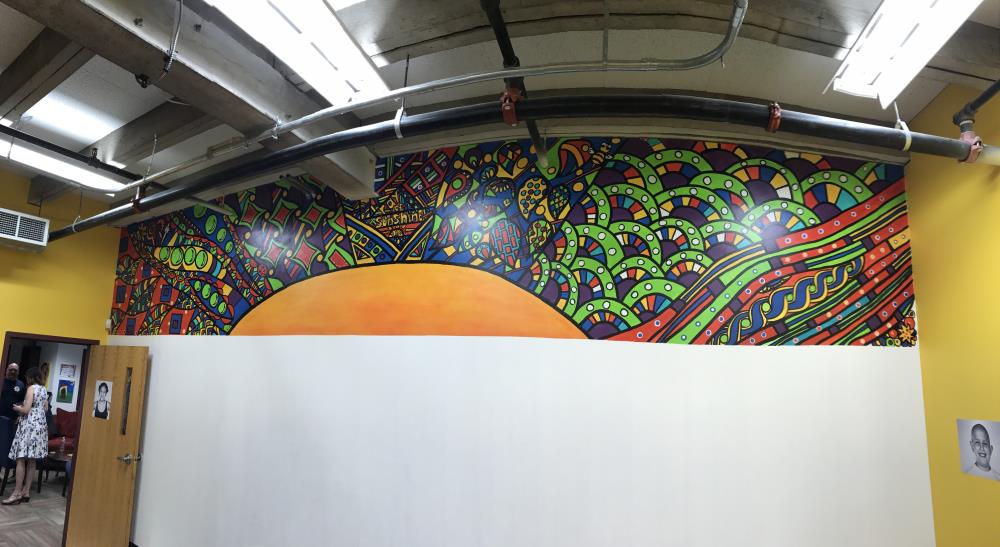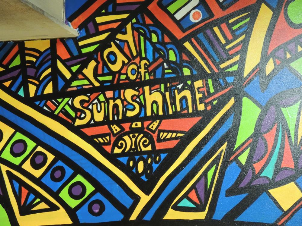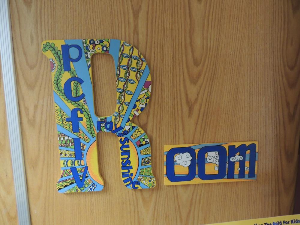 The room features a large mural painted by local artist Ellen Kalinosky. The mural features a large sun with several hidden images and symbols, along with a large dry erase area for children to show off their creativity. Along with the mural PCFLV has created a worksheet to interact with the mural. Look through the photos and see how many items you can find hidden in the mural. (Bee, Elephant, Ladybug, Turtle, Star of Bethlehem, the word “Hope”, the words “Ray of Sunshine” and many more hidden images).