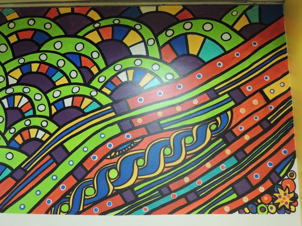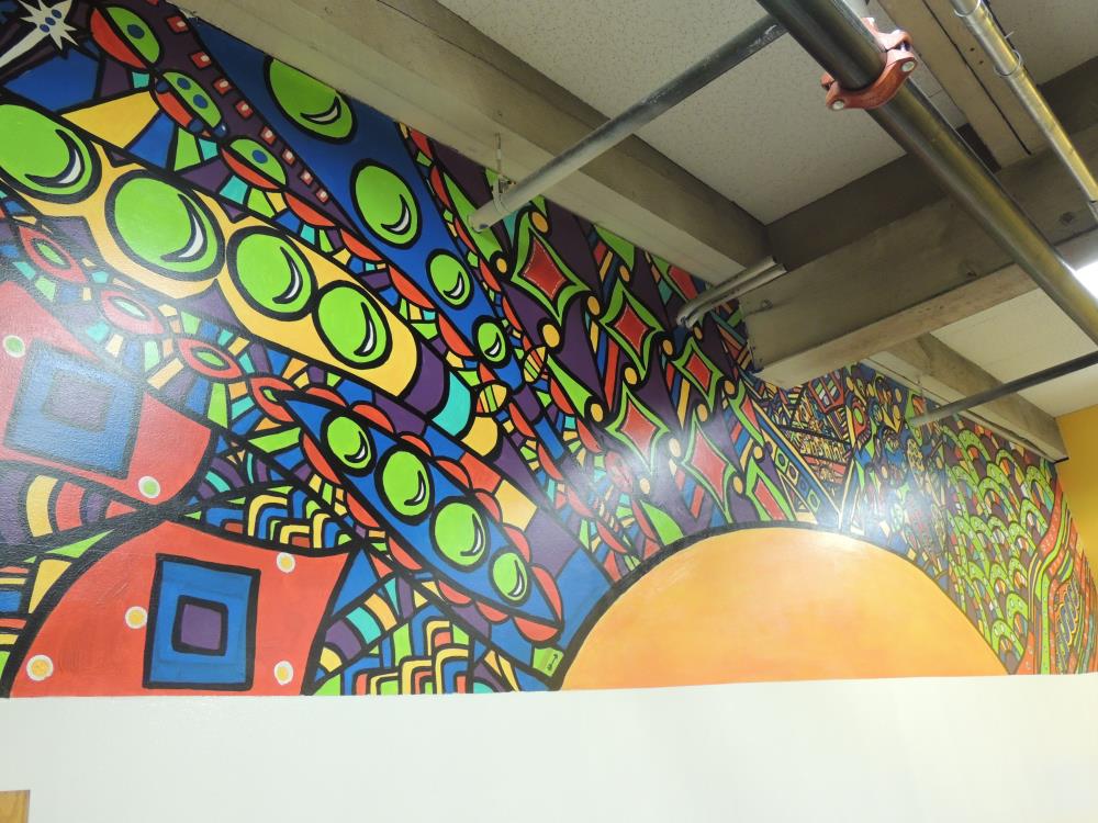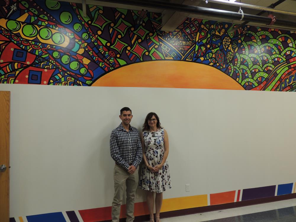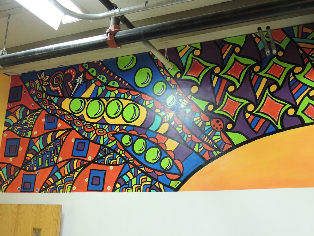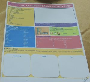 The room features a large mural painted by local artist Ellen Kalinosky. The mural features a large sun with several hidden images and symbols, along with a large dry erase area for children to show off their creativity. Along with the mural PCFLV has created a worksheet to interact with the mural. Look through the photos and see how many items you can find hidden in the mural. (Bee, Elephant, Ladybug, Turtle, Star of Bethlehem, the word “Hope”, the words “Ray of Sunshine” and many more hidden images).