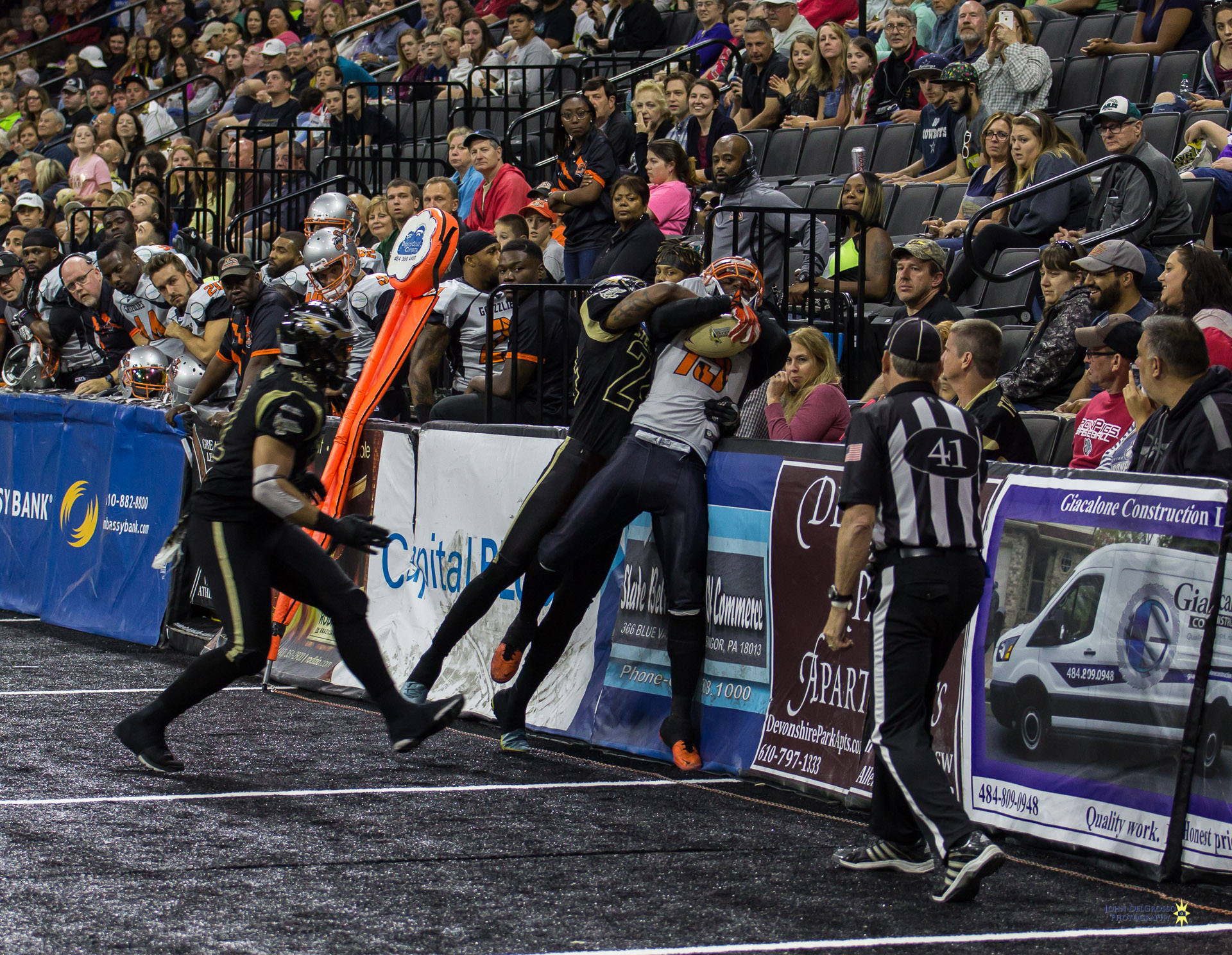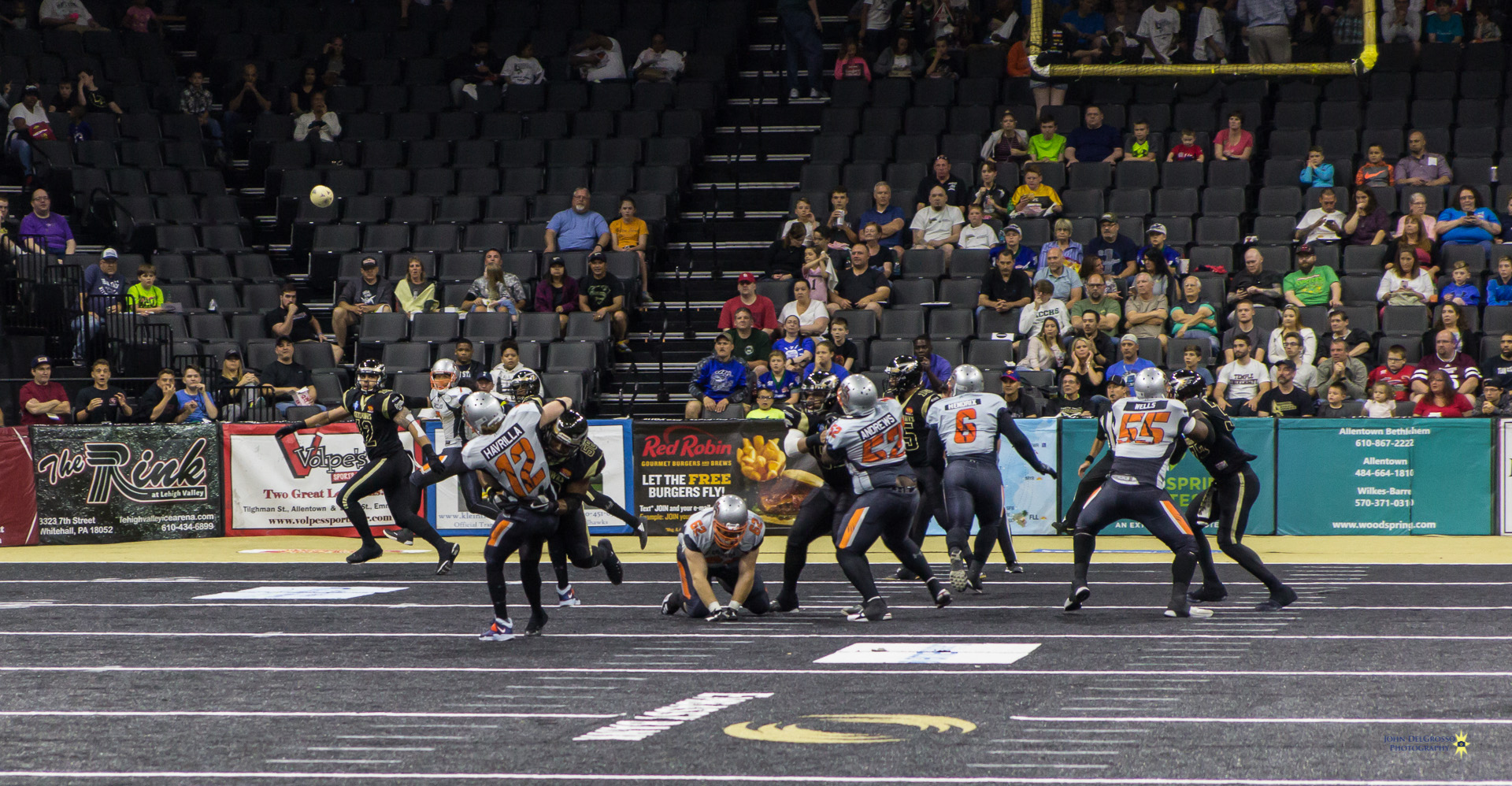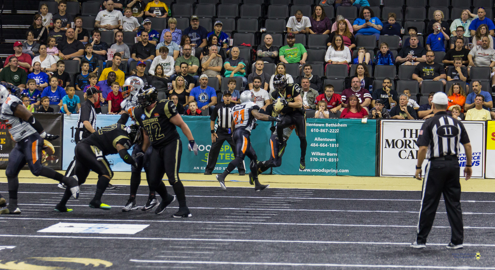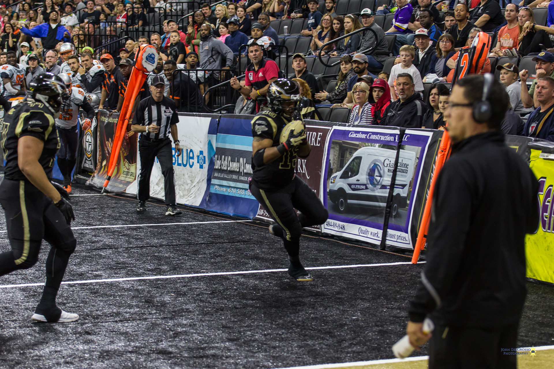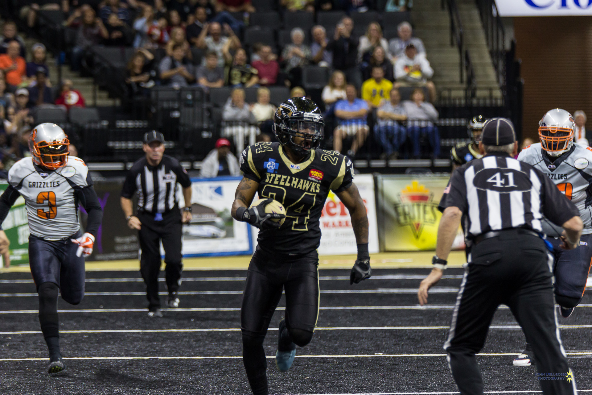 With under 11 minutes left in the 2nd qtr., it was a back-and-forth game. TD Hawks by Oliver Jr. making it 16 – 9. Grizzlies answer it and tie it up 16-16. When the games are tight/close in score, it makes it for an interesting game, indeed! High Country kicks off and takes the lead 18-16 w/ a deuce. Quick conversation, TD Hawks, Tralli on the grab, followed with a deuce making the score 25-18! Crowd was getting pumped! Hawks increase the lead to 31-18 with 17 seconds left in the 1st half. I was 4 rows from the field when Hall Jr. received the kick and ran for a 50 yard TD bringing the score to 39 – 18 SteelHawks! Explosive 2nd Qtr., to say the least!