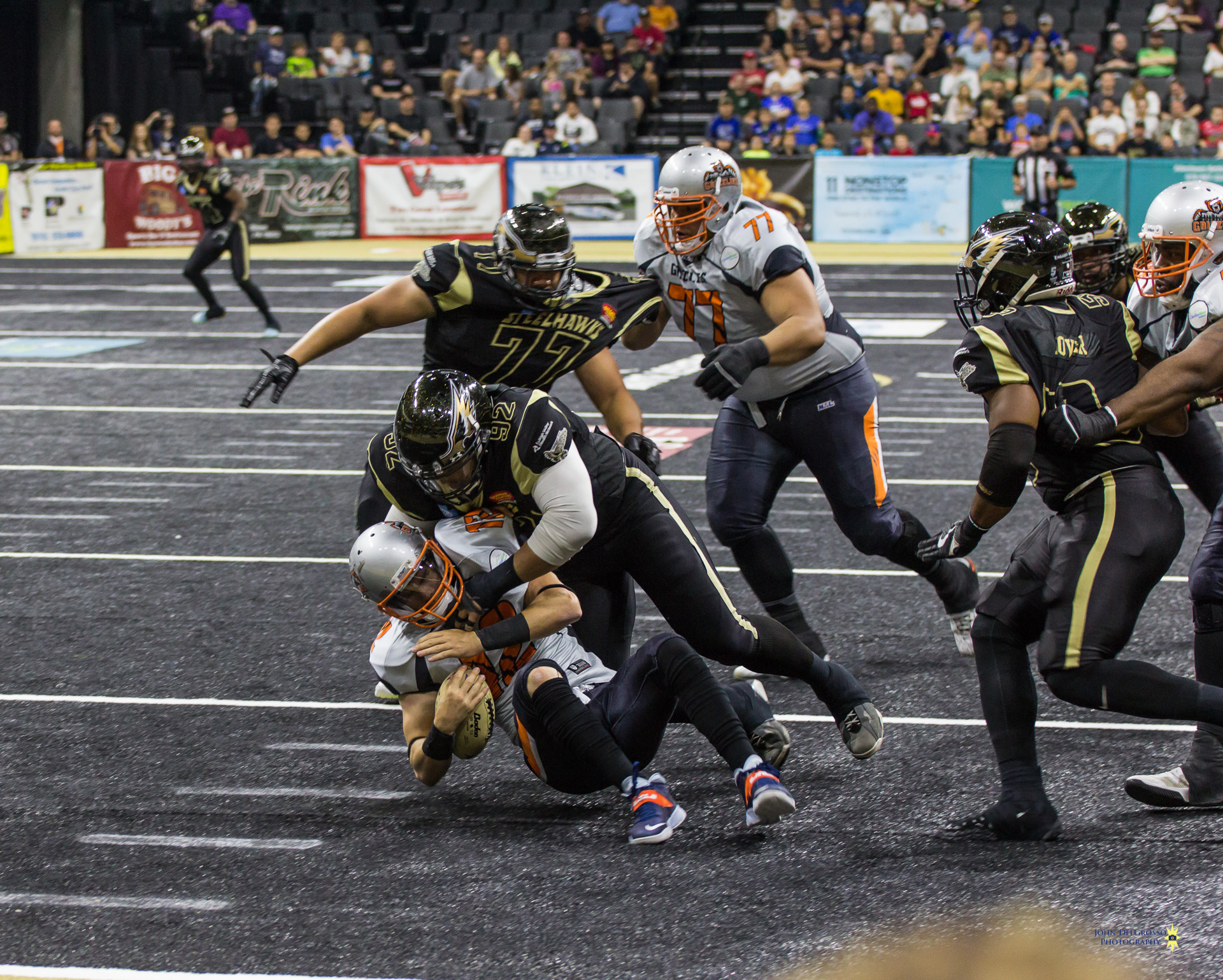 First quarter started off touch and go, ball handed back and forth. Then there was a play where Alvarez strips it, Steelhawks recover. And follow it with a quick TD to Renford making it able for the Hawks to put numbers up on the board first: 7-0 LV. With 30 seconds left in the 1st Qtr., the Grizzlies get a Safety and Hotaling gets a Deuce making the score 9-2. Start of the 2nd qtr., High Country scores making it a tie game 9-9.