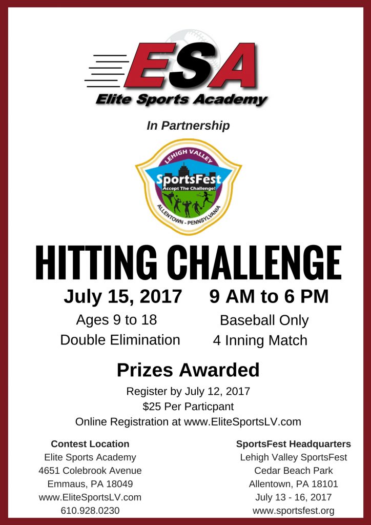 June 14, 2017 (Emmaus, PA) Elite Sports Academy announce today they will host a baseball hitting challenge as part of Lehigh Valley SportsFest for ages 9 to 18. The Challenge will be held on Saturday, July 15 beginning at 9 AM. Elite Sports Academy is located at 4651 Colebrook Avenue, Emmaus, PA 18049.