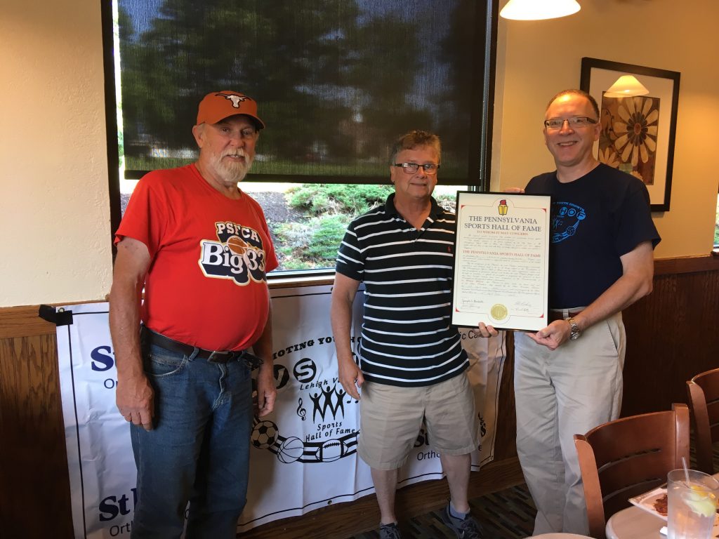 Left to right: LVSHOF VP Joe Mayer, PASHOF Sr. VP Joe Bordell, and LVSHOF Chairman Ed White, who is also the President of the new Lehigh Valley – Pocono Chapter of the PA Sports Hall of Fame. Bordell presented the Charter of the new Chapter to White and Mayer at a regional meeting of the PASHOF on June 28 in Hazelton.