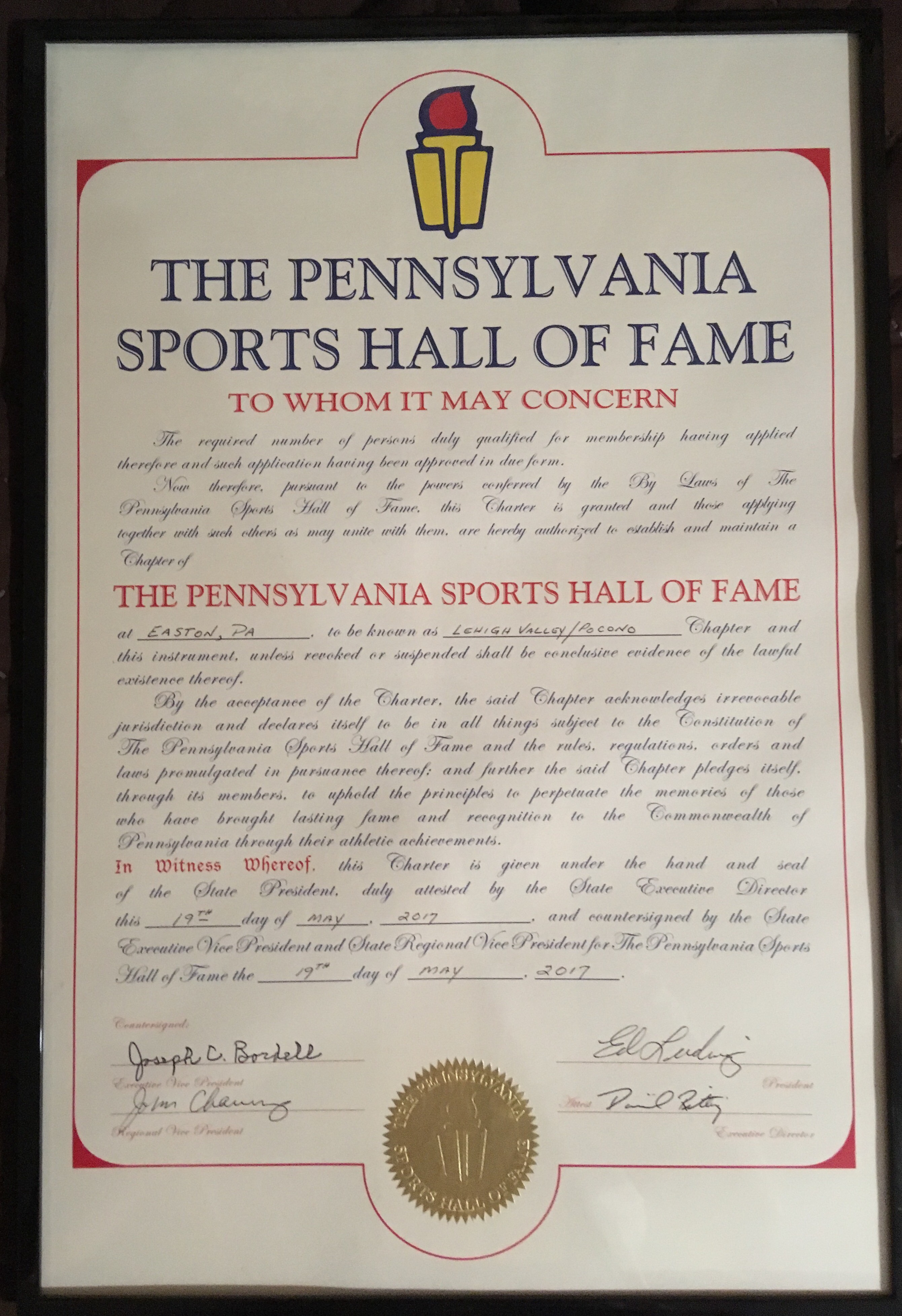 The Charter of the new Lehigh Valley – Pocono Chapter of the Pennsylvania Sports Hall of Fame approved by the PASHOF Board on May 19.