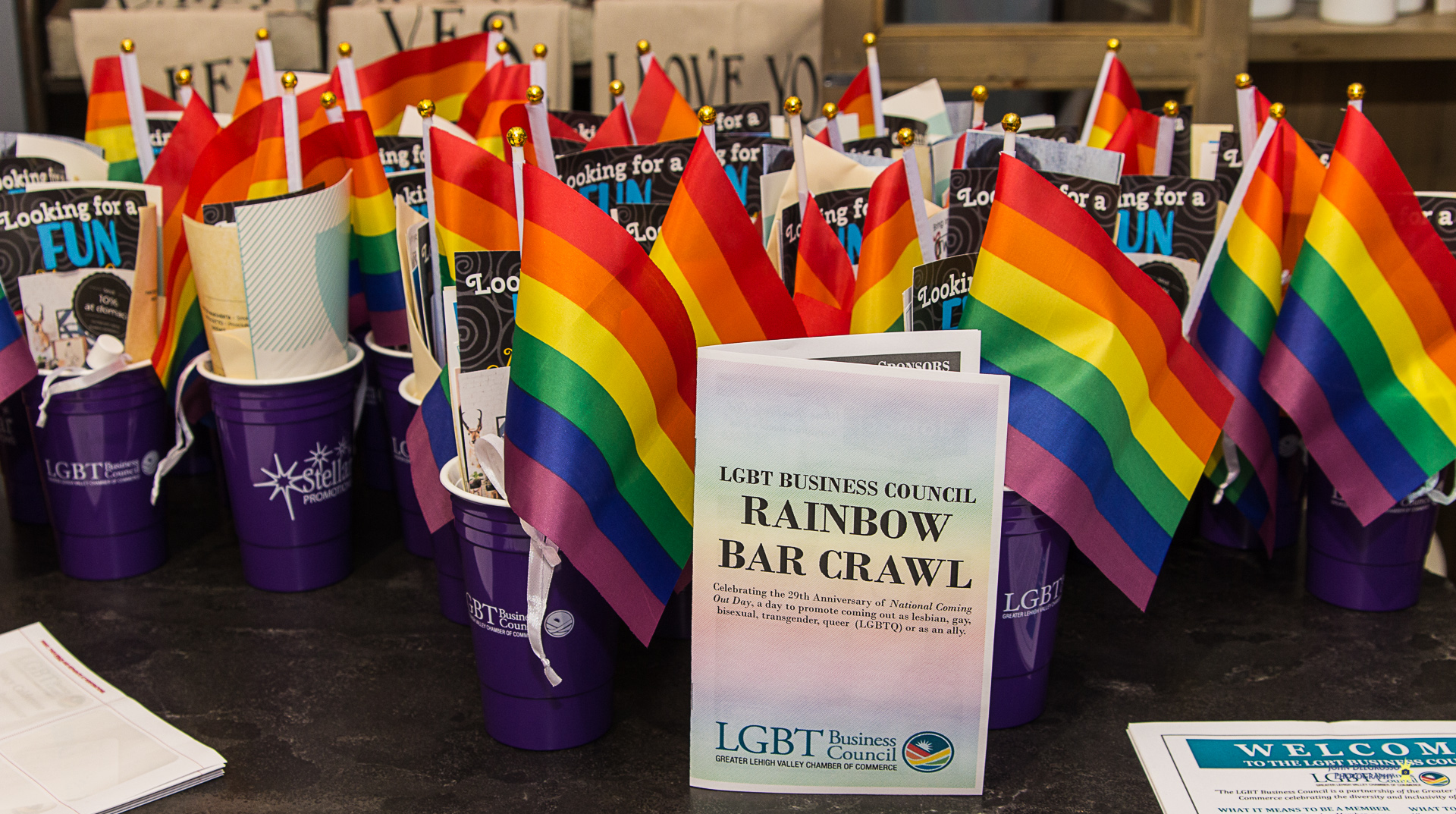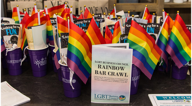 The LGBT Business Council celebrated National Coming Out Day with a Rainbow Bar Crawl. The crawl included sampling signature drinks a different color of the rainbow at the participating bars/restaurants. Participants also received a signature bar crawl cup and complimentary appetizers from each location.