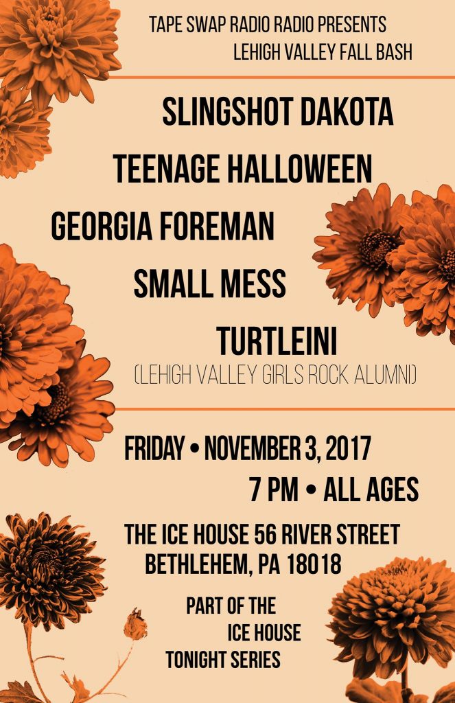 (Bethlehem, PA)– A handful of bands from the Lehigh Valley’s independent music scene will converge in Bethlehem next week for Tape Swap Radio’s first ‘Lehigh Valley Fall Bash.’ On Friday, November 3, 2017, Tape Swap Radio will host three established Lehigh Valley bands at the Charles A. Brown Ice House: Slingshot Dakota (indie punk), Georgia Foreman (noise pop), and Small Mess (indie rock). Joining them is Asbury Park, NJ’s Teenage Halloween (indie punk).