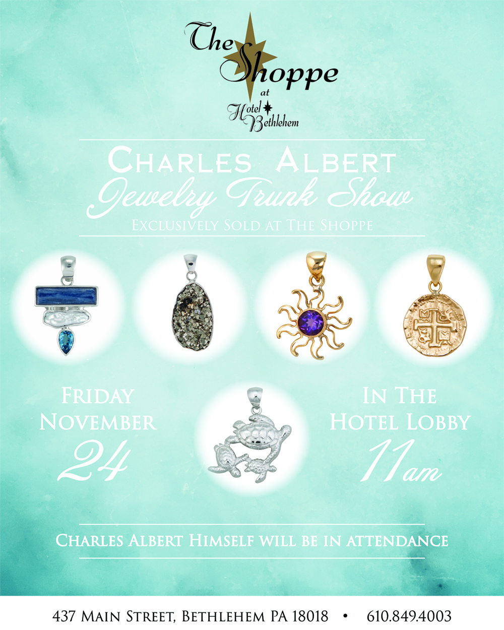 BETHLEHEM, PA – This black Friday, November 24th guests will be able to do some exclusive Christmas shopping in the lobby of Hotel Bethlehem with a private trunk show. Charles Albert will be showcasing his Alchemía Collection, a hand-crafted artisan gemstone jewelry line, that the Shoppe at Hotel Bethlehem carries year round.