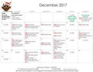 To allow our staff & patrons to celebrate, the Library will be closed Saturday, December 23- Monday, December 25. No items are due on these dates.