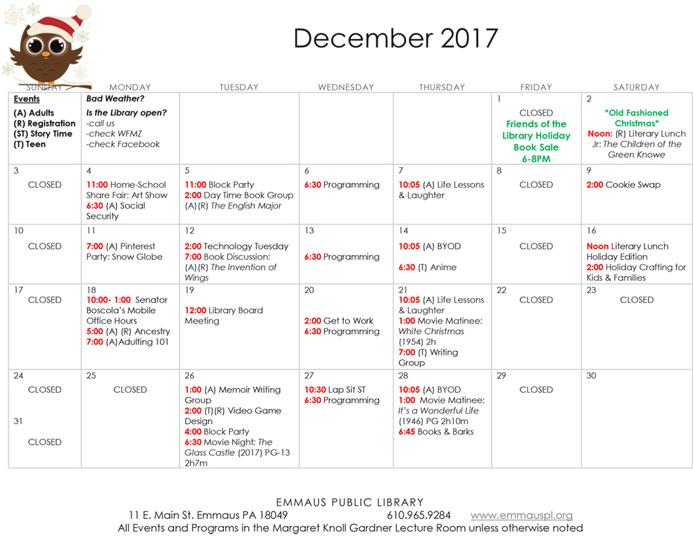 Join us in celebrating the Christmas season with our annual Friends of the Emmaus Public Library Book Sale Friday, Dec. 1 from 6-8PM. Please note that the Library is CLOSED during this event. Stop in or check our website for more information. On Saturday, Dec. 2; Join Miss Sue for Story Time at 10:30, Christmas Crafts at 11AM and The Muppet Christmas Carol (1992) G 1h 25m at 2PM.