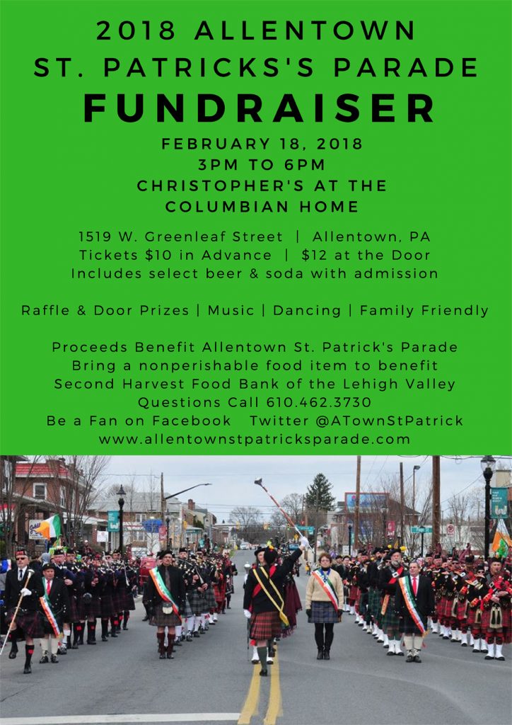 January 24, 2018 (Allentown, PA) The Allentown St. Patrick’s Parade Committee, Inc. announced today the details regarding the 16th Annual Fundraising Event to be held at Christopher’s at the Columbian Home on Sunday, February 18, 2018 from 3 pm to 6 pm. The Fundraiser kicks off “Parade Season” in Allentown’s West End culminating in the 61st Allentown St. Patrick’s Parade being held March 18, 2018 at 1:30 pm. Christopher’s at the Columbian Home is located at 1519 Greenleaf Street, Allentown, PA. Proceeds will benefit the Allentown St. Patrick’s Parade.