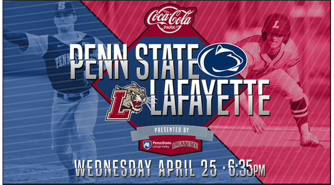 CENTER VALLEY, Pa. (Mar. 27, 2018) – Penn State alumni and friends are invited to show their Penn State pride as the Penn State University baseball team battles Lafayette College at the first-ever college baseball game in Coca-Cola Park, home of the Lehigh Valley IronPigs, at 6:35 p.m. on Wednesday, April 25.