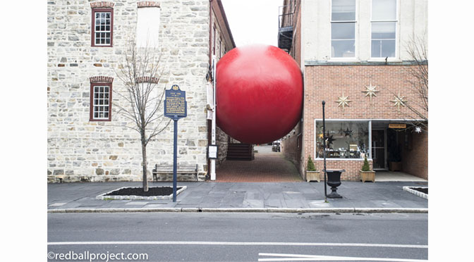 BETHLEHEM, PA—Wedged between buildings, the 250-pound giant red ball known simply as ‘RedBall’ made its debut in Bethlehem today, magically appearing at the historic Sun Inn in the city’s Historic District. People who want to catch a glimpse of the 15 foot in diameter ball, or grab a photo with it, can do so through April 22. Each day from noon-7 p.m. the ball will appear in a new location in Bethlehem as part of ArtsQuest’s SouthSide Arts & Music Festival (SSAMF) taking place April 20-21.